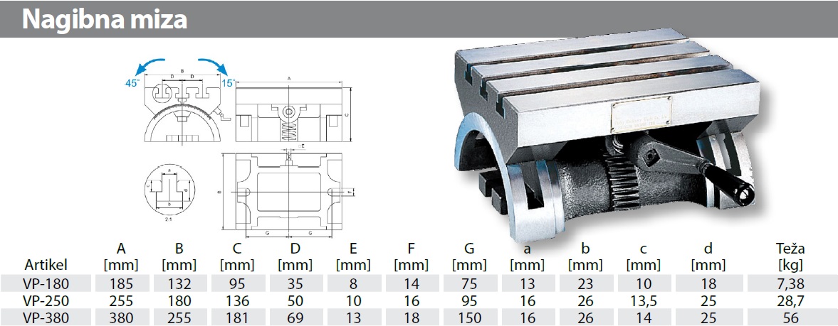 Nagibne, križne in kotne mize: Nagibna miza 185x132 mm, točnost nagiba je 0,02 mm Na vrh
